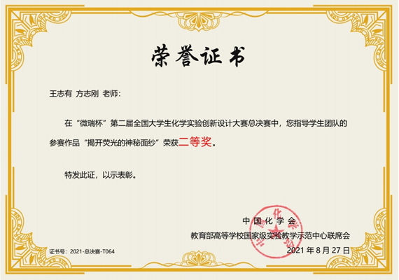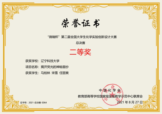 8月25日-27日,“微瑞杯”第二届全国大学生化学实验创新设计竞赛全国总决赛在青岛科技大学举行。九州体育·(中国)官方网站化学工程学院应用化学系马桂林、宋雪、任丽爽3人团队的科普实验作品“揭开荧光的神秘面纱”(指导老师:王志有、方志刚)获二等奖。