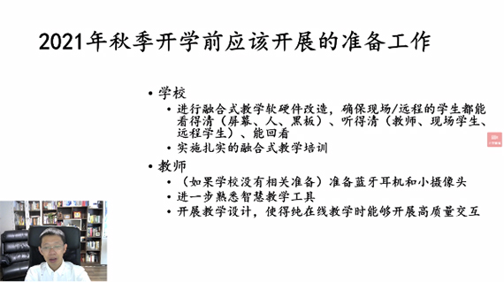 清华大学线上教学和融合教学指导专家组组长于歆杰教授在“关于2021年秋季学期开展融合式教学的考虑”中指出今年秋季学期的线上教学和2020年2月相比教师和学生的在线教学意识有了明显的转变,随着在线教学工具和在线教学技能的提升,学生对在线学习的预期也在不断提高。以网络会议直播的形式不再能满足在线教学要求,教师可以采用大规模实时交互式在线教学和线下线上融合式教学方式做好2021秋季开学前的准备。