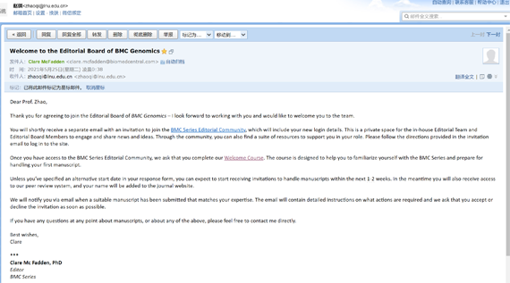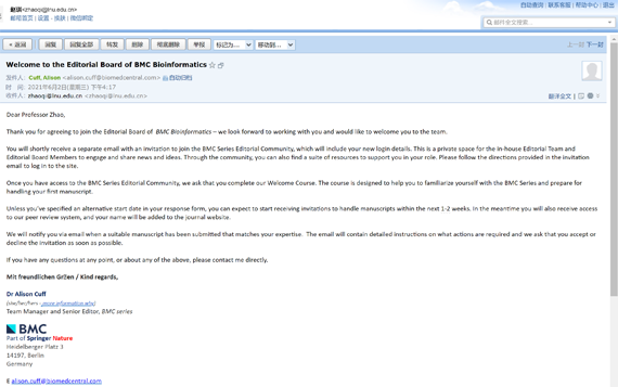 近日,九州体育·(中国)官方网站计算机与软件工程学院教授赵琪收到BMC出版集团Dylan Smith博士邀请,受邀分别担任BMC Genomics和BMC Bioinformatics编委。