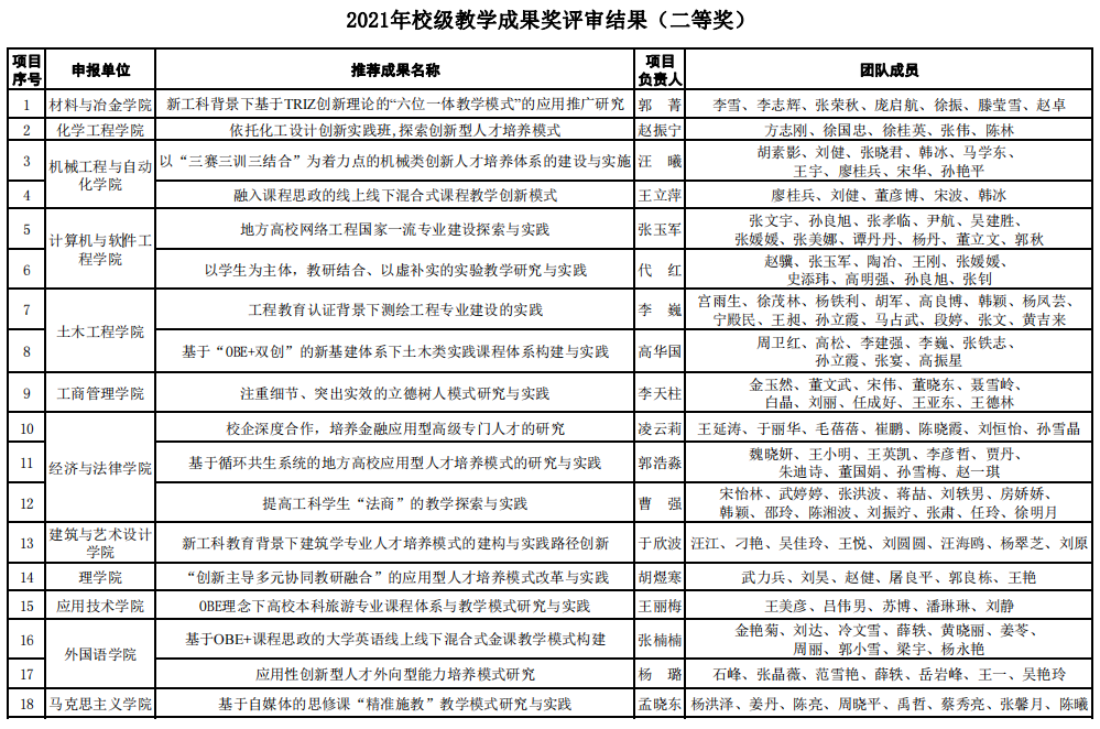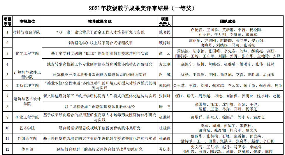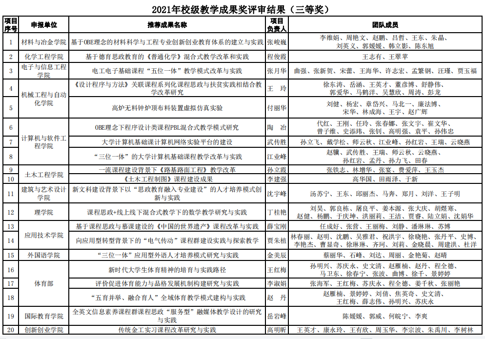 根据《关于开展九州体育·(中国)官方网站2021年教学成果奖评选工作的通知》(九州(中国)教发【2021】35号)相关工作安排,各教学单位推荐参评2021年校级教学成果奖共62项。经专家评审,学校研究决定2021年校级教学成果奖获奖项目为50项,其中一等奖12项,二等奖18项,三等奖20项。获奖名单公布如下: