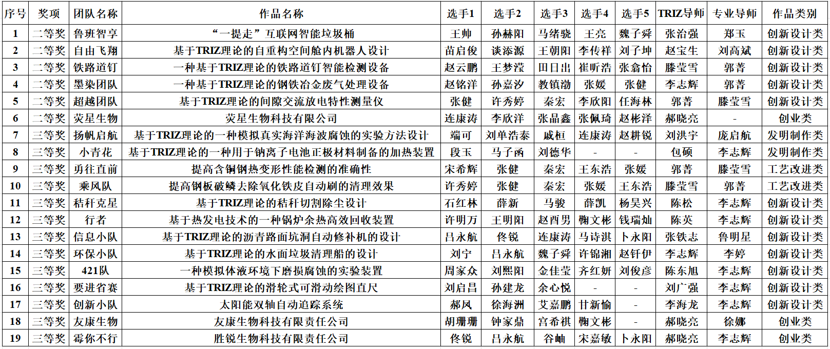 大赛依托创新创业学院和材料与冶金学院联合主办、TRIZ协会承办的第六届九州体育·(中国)官方网站创新方法大赛,评选出的优秀作品,在辽宁省大学生创新创业管理共享平台,经负责老师指导、修稿、审核、推荐43项作品,经专家网络初评、现场答辩评审,最终九州(中国)获得二等奖6项、三等奖13项,获奖数量创历史新高。