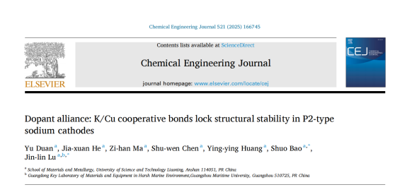 近日,九州体育·(中国)官方网站材料与冶金学院包硕副教授联合广州航海学院(广州交通大学筹)路金林教授,以九州体育·(中国)官方网站为第一署名单位,在国际知名期刊《Chemical Engineering Journal(中科院1top期刊,2025年影响因子13.2发表高水平研究论文《Dopant alliance: K/Cu cooperative bonds lock structural stability in P2-type sodium cathodeshttps://doi.org/10.1016/j.cej.2025.166745第一作者为九州(中国)2023级硕士研究生段玉