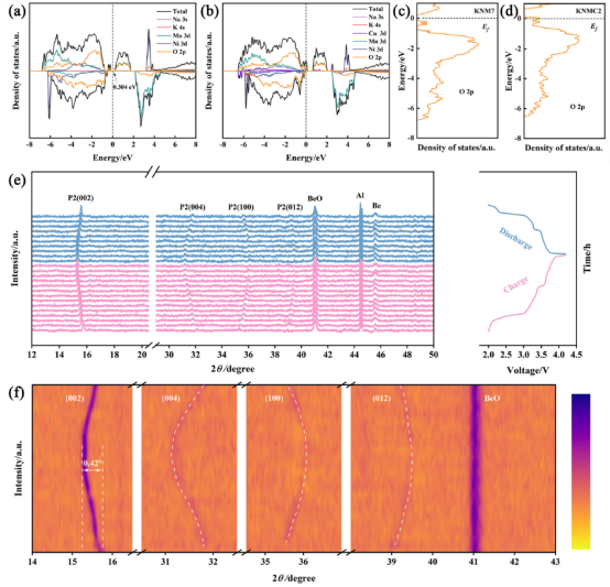 钠离子电池P2型层状氧化物压下易发生P2-O2相变等问题导致材料结构失稳、离子传输缓慢。本研究通过K/Cu协同调控钠离子电池层状氧化物正极材料,基于层间钉扎(K+)与电子结构调控(Cu2+“碱金属/过渡金属协同-结构动态稳定的新策略,扩大层间距的同时降低Jahn-Teller活性离子Mn3+的比例,抑制充放电过程中不可逆P2-O2相变,(002)衍射峰偏移仅0.42°。所制备的正极材料200 mAg-1 高倍率下循环200次后容量保持率可达96.80%,显著优于单一K掺杂样品89.83%)。钠离子扩散系数(DNa+)提升至1.06×10−10 cm2s-1K/Cu协同调控后正极材料因自旋极化呈半金属特性,费米能级附近电子态密度增加,提升了电子/离子传输效率。该研究开发低成本、长寿命储能体系具有重要参考价值。