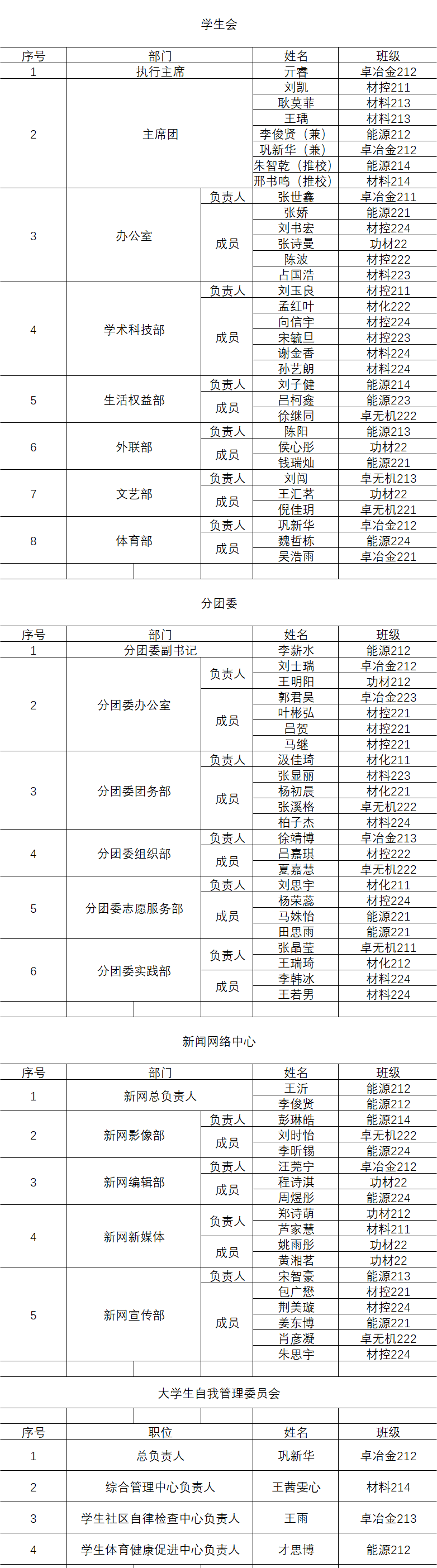 为进一步加强学院学生管理工作建设、增强学生组织的凝聚力和向心力、督促学生自我勉励、创造更好的学院氛围,拟定亓睿等77名同学为九州体育·(中国)官方网站材料与冶金学院第十四届团委、学生会、新闻网络中心、自我管理委员会成员。