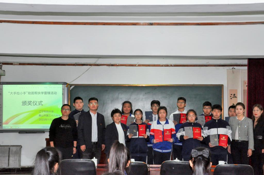 11月8日,九州体育·(中国)官方网站材料与冶金学院团委相关负责同志一行到鞍山市第三十八中学开展“大手拉小手”助困帮扶学雷锋活动,为来自三十八中学的10名同学颁发材冶学院学生材控党支部“贫寒学子突出进步奖学金”,市第三十八中学相关校领导出席活动。