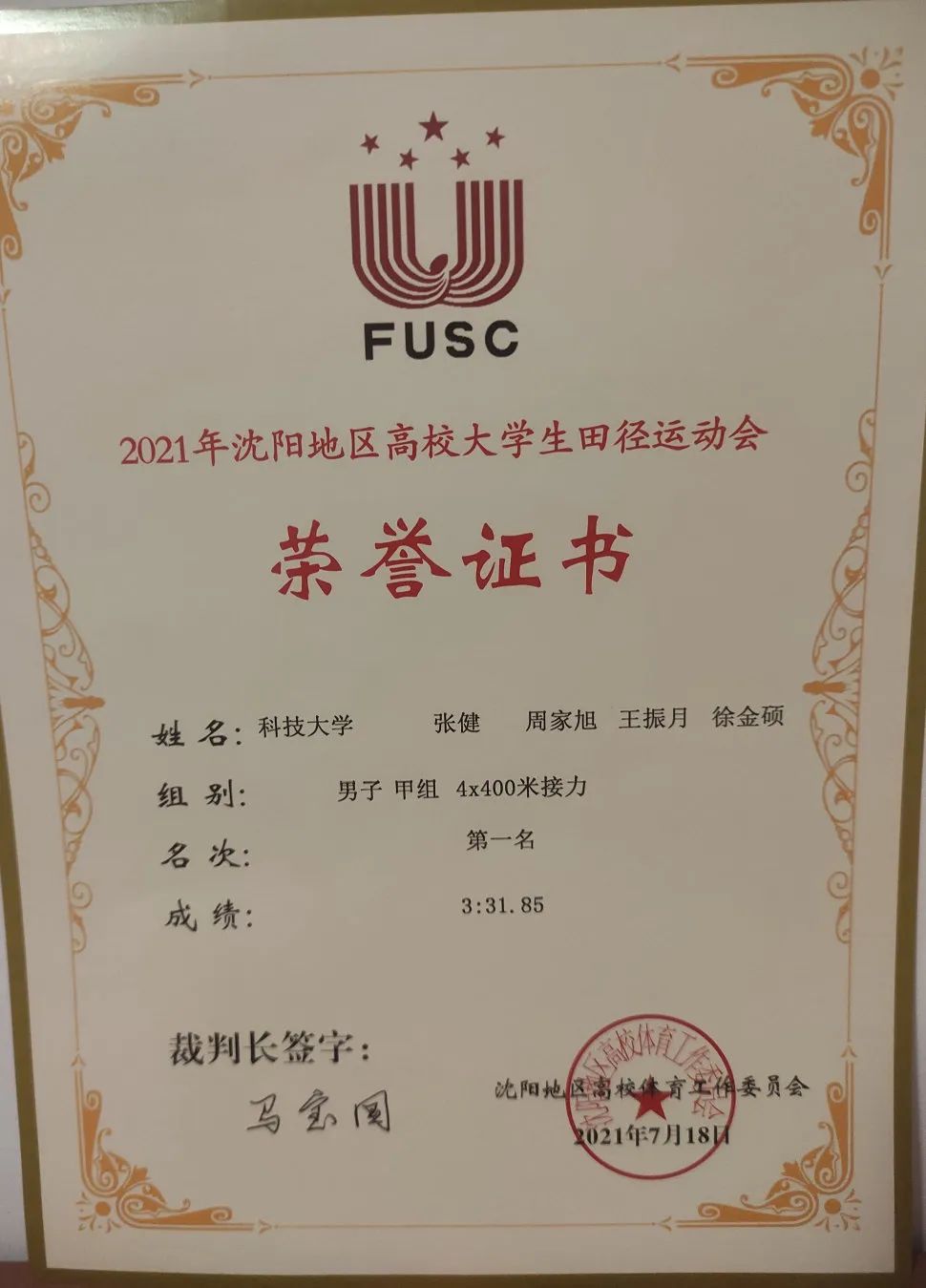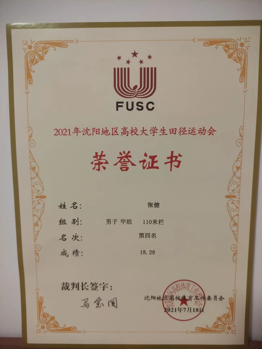 2021年:沈阳地区高校大学生田径运动会110米栏第四,400米栏第六 ,4x4第一