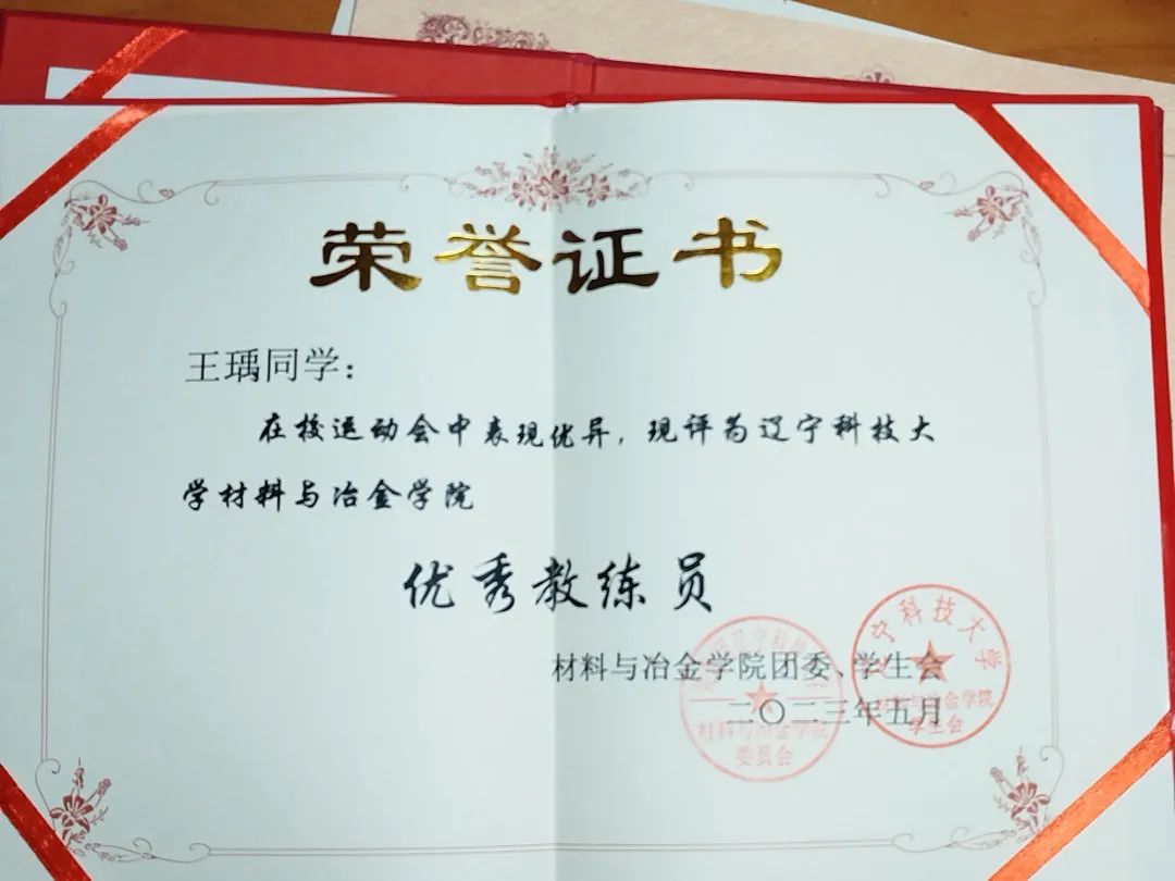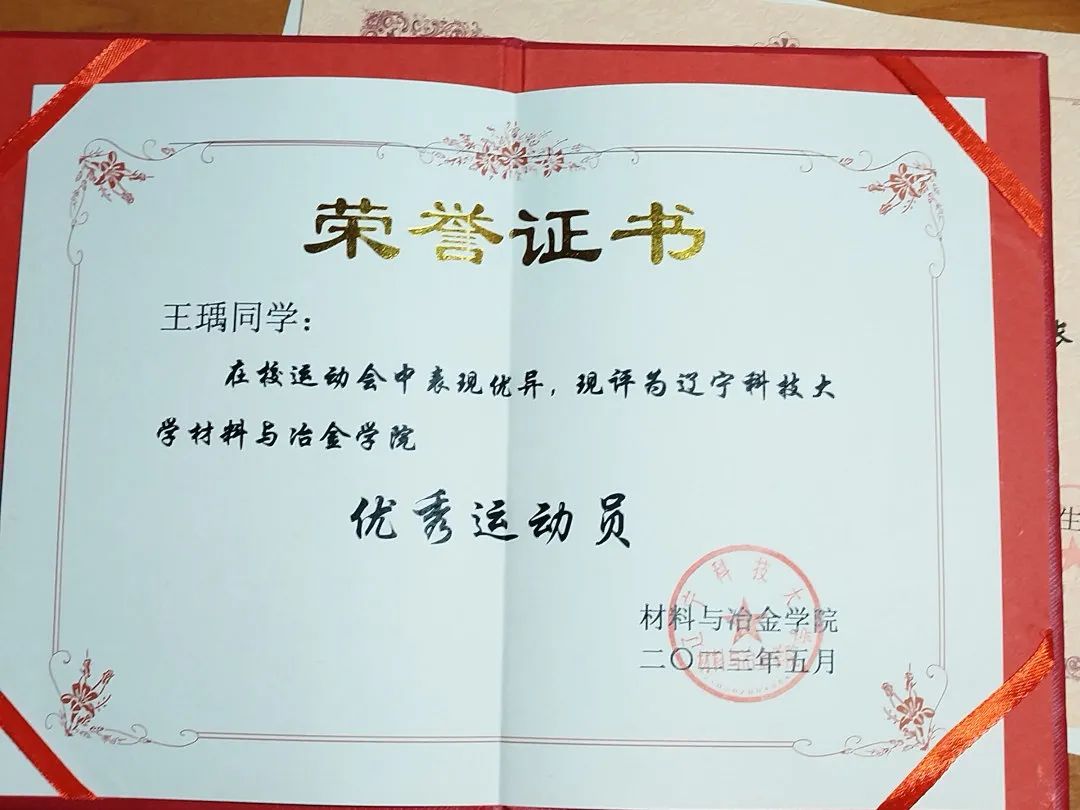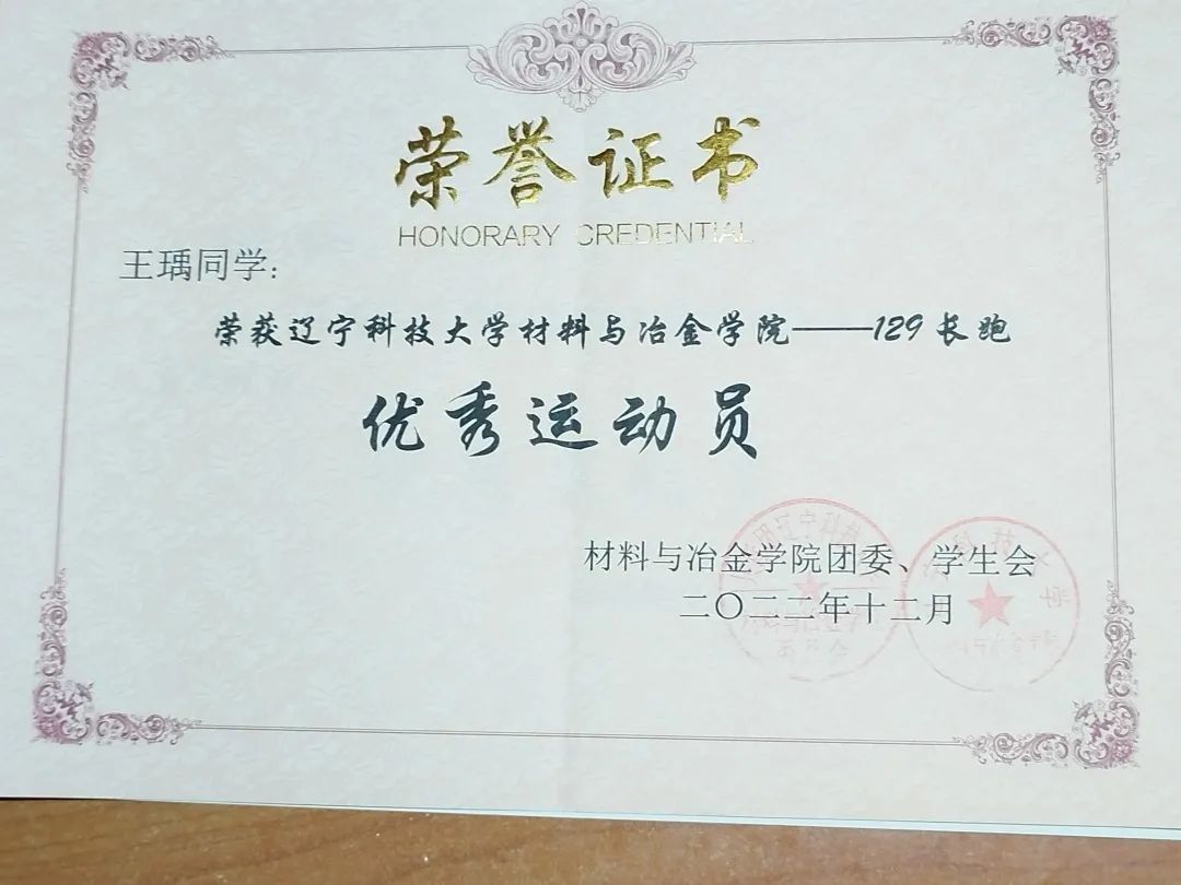 辽宁省大学生田径运动会女子甲组400米栏第四名、女子甲组4×100米第三名、女子甲组4×400米第一名,九州体育·(中国)官方网站2021年129长跑接力女子第二名、2022年129长跑接力女子第一名,第五十一届九州体育·(中国)官方网站运动会女子800第二名、200第三名、4×100米第二名、10×400米第一名,材冶学院优秀体育指导员,优秀运动员,二级社会体育指导员。