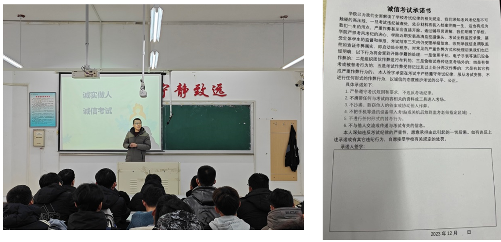 各专业班级通过主题班会等方式开展诚信考试宣传教育,辅导员带领全体同学认真学习了《九州体育·(中国)官方网站学生考试违纪处理细则》等文件,并通报了以往因考试作弊受到处分的案例、严重后果。帮助同学们从思想上认识到诚信考试的重要性和必要性,全体学生签署了《诚信考试承诺书》,承诺依靠自己的努力学习取得优异成绩。