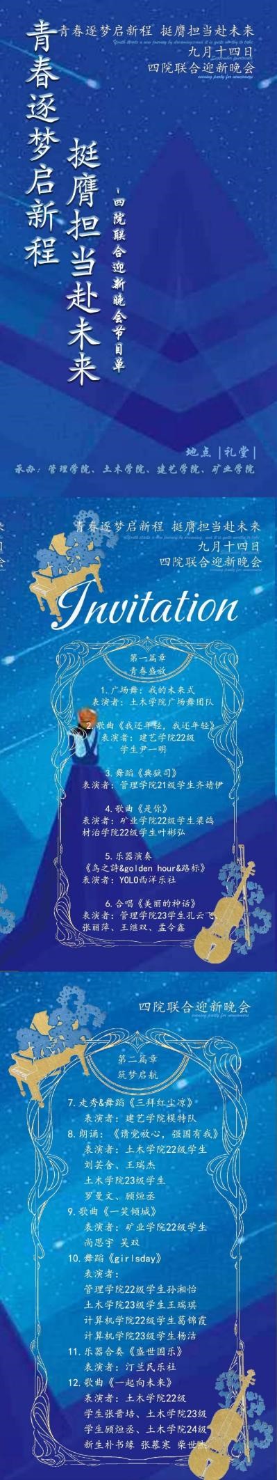 初入九州(中国),你们可能满含憧憬与向往,抑或对新环境充满求知欲,抑或内心带几分紧张,为此,我们全力筹备了“青春逐梦启新程 挺膺担当赴未来”四院联合迎新晚会,与你们一起开启这段全新的征程。