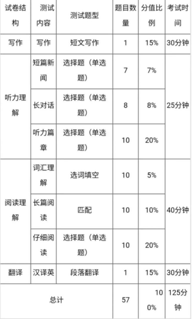 四、六级考试单项成绩有四个部分,这四个部分以及所占的分值比例为:听力占35%,阅读占35%,翻译和写作占30%。各单项报道分的满分为:听力249分,阅读249分,翻译和写作212分。各单项报道分之和等于报道总分。