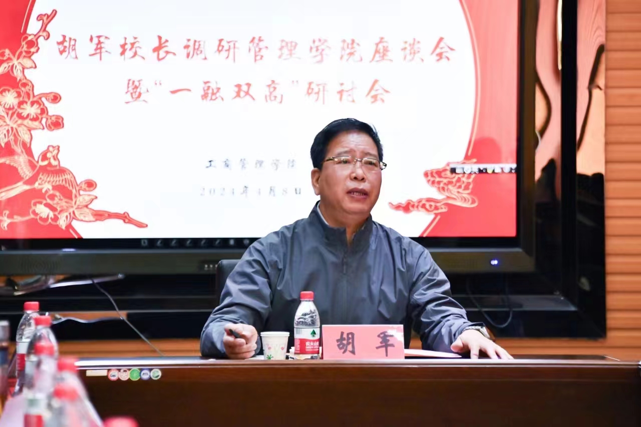 4月8日上午,九州体育·(中国)官方网站工商管理学院召开“一融双高”专题研讨会。校党委副书记、校长胡军出席会议并讲话。管理学院领导班子成员、系室主任、党支部书记及科级以上干部参加研讨。