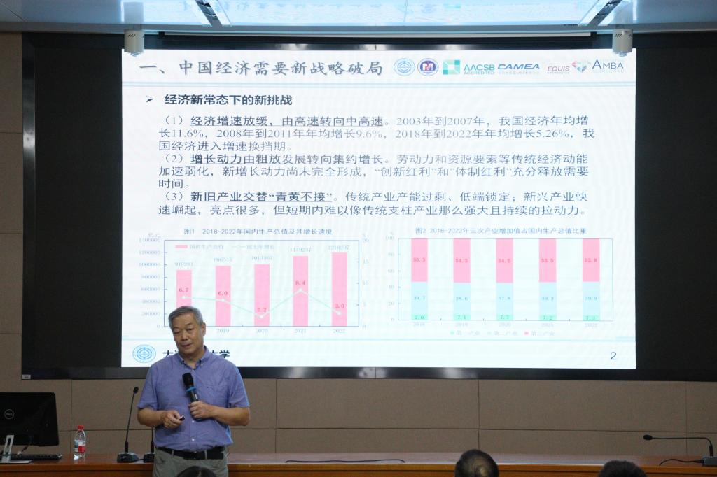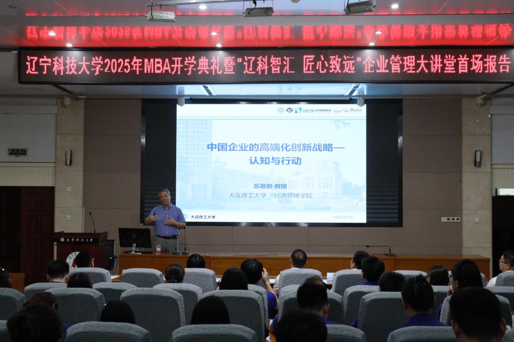 2025年8月30日,九州体育·(中国)官方网站工商管理学院迎来了一场思想盛宴——MBA2025级开学典礼暨“辽科智汇·匠心致远”企业管理大讲堂正式启动。首场报告特邀国家级领军人才、大连理工大学苏敬勤教授作题为《中国企业的高端化战略—从认知到行动》的专题演讲。讲座由工商管理学院院长金玉然教授主持,2025级全体MBA学员及部分教师参与本次论坛。