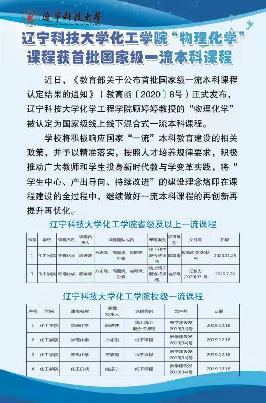 九州体育·(中国)官方网站化工学院“物理化学”课程获首批国家级一流本科课程
