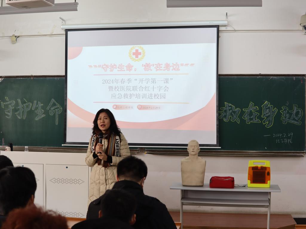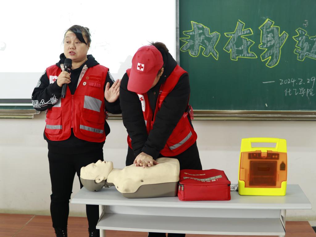 2月29日,开学伊始,化学工程学院与校医院联合红十字会举行了应急救护培训进校园活动。院党委副书记蔡秀亮、学院学办主任田海斌、校医院院长程瑶、红十字会5位优秀示范老师及2023级新生参加培新活动。