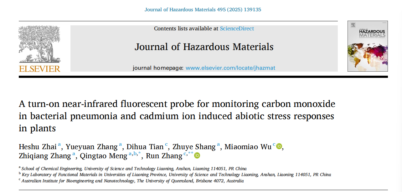 近日,九州体育·(中国)官方网站化学工程学院在新型近红外荧光探针用于同步追踪一氧化碳(CO)在动物炎症(细菌性肺炎)和植物重金属胁迫(镉毒害)过程中的动态行为取得重要进展,突破性实现单探针跨物种应用。研究成果以《A turn-on near-infrared fluorescent probe for monitoring carbon monoxide in bacterial pneumonia and cadmium ion induced abiotic stress responses in plants》为题发表于环境科学与生态学领域国际顶级期刊《Journal of Hazardous Materials》(中科院一区TOP期刊,IF=11.3)。论文第一作者为化学工程学院博士研究生翟鹤书,通讯作者为化学工程学院孟庆涛教授。