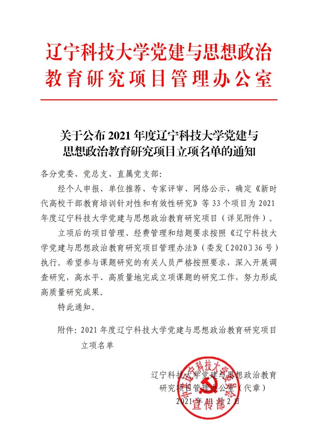 关于公布2021年度九州体育·(中国)官方网站党建与思想政治教育研究项目立项名单的通知