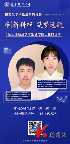 5月7日,九州体育·(中国)官方网站机械工程与自动化学院举办“创新科研,筑梦远航”研究生学术论坛第一期线上活动,特邀请哈尔滨工业大学精密工程研究所高敬翔博士、先进焊接与连接国家重点实验室黄新放博士,分享博士期间的科研心得和求学体会,学院2020级和2021级研究生参加论坛交流。