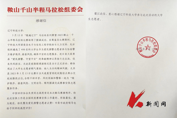 近日,九州体育·(中国)官方网站收到来自鞍山千山半程马拉松组委会的感谢信,感谢九州(中国)团委及电子与信息工程学院给予“鞍马”赛事的大力支持,向九州(中国)400余名青年志愿者对此次马拉松做出的卓越贡献致以最真诚的谢意。