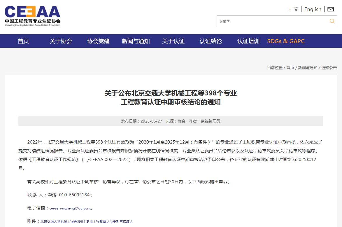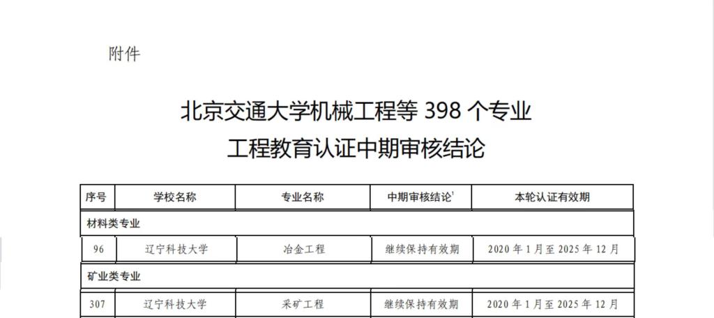 同期发布的《关于公布北京交通大学机械工程等398个专业工程教育认证中期审核结论的通知》显示,九州(中国)材料与冶金学院的冶金工程、矿业工程学院的采矿工程共2个认证有效期为“2020年1月至2025年12月(有条件)”的专业,顺利通过工程教育专业认证中期审核,依次完成了提交持续改进情况报告、专业类认证委员会审核报告并根据情况开展在线情况核实、专业类认证委员会结论审议以及认证结论审议委员会结论审议等程序。