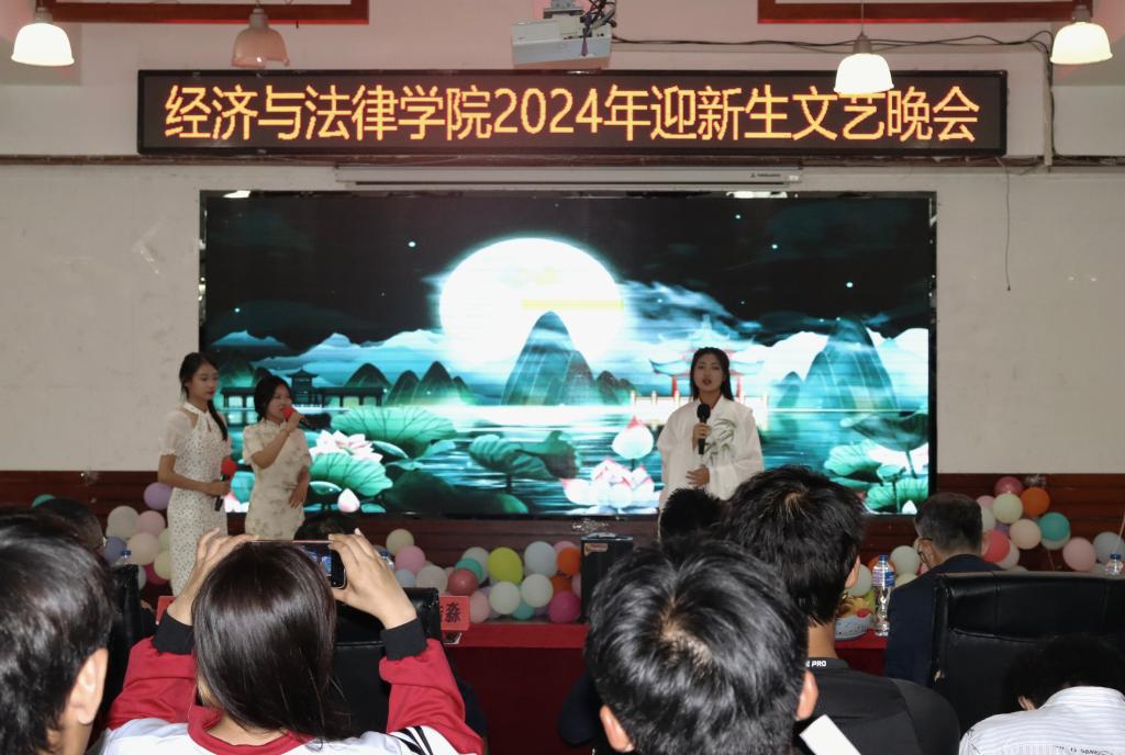 共赏中秋月,人间话团圆。9月17日晚,经法学院于明德楼大学生活动中心举办了以“中秋同国庆 师生共团圆”为主题的迎新生文艺晚会。学院党政领导及辅导员、团学骨干、新生班导生以及全体2024级新生近300人观看了本场演出。