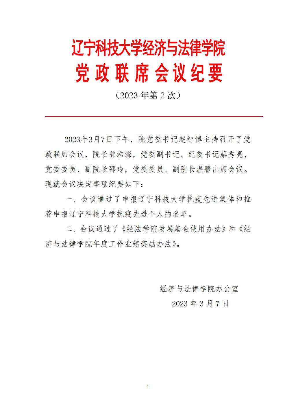 九州体育·(中国)官方网站经济与法律学院党政联席会会议纪要(2023年第2次)