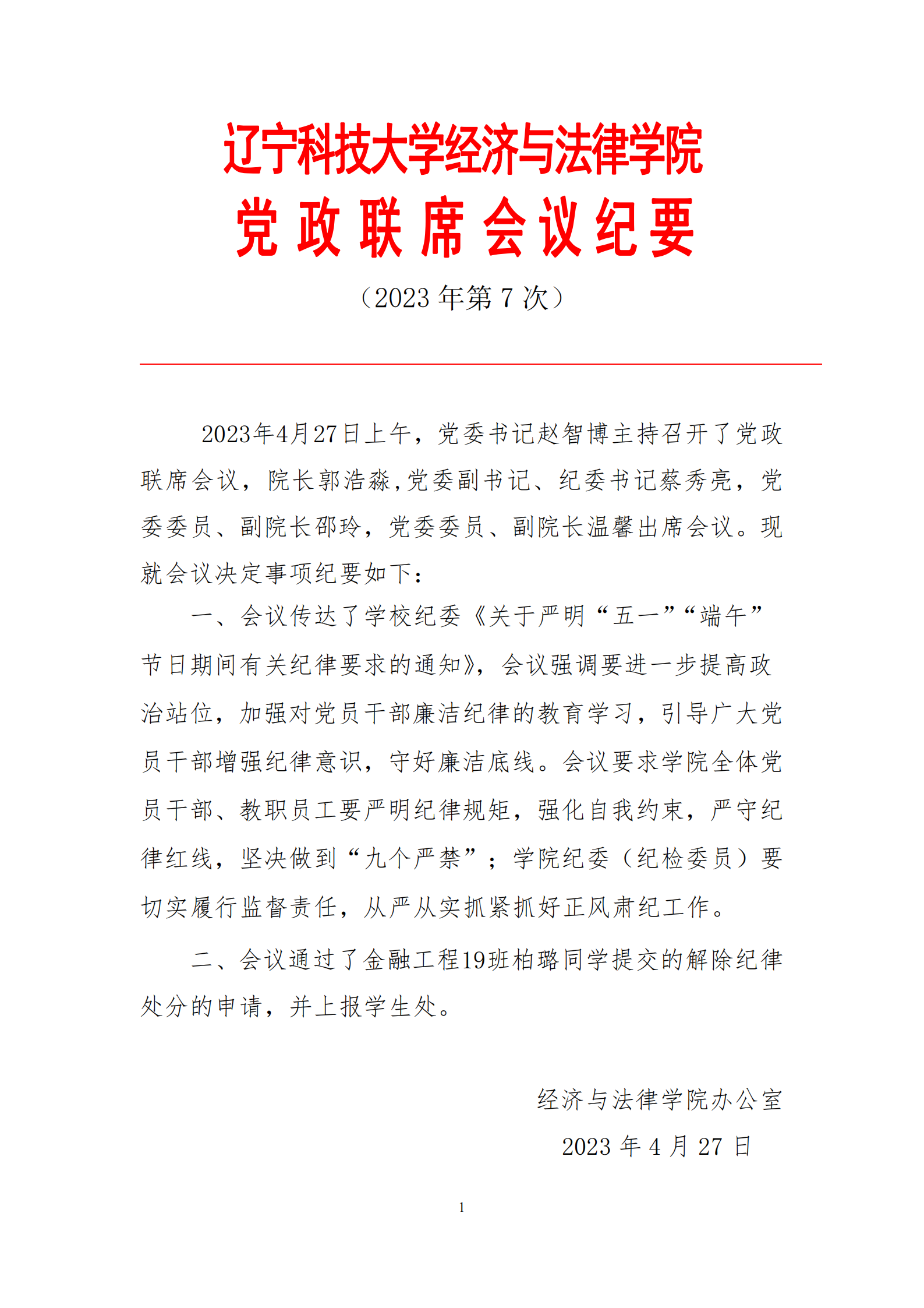 九州体育·(中国)官方网站经济与法律学院党政联席会会议纪要(2023年第7次)