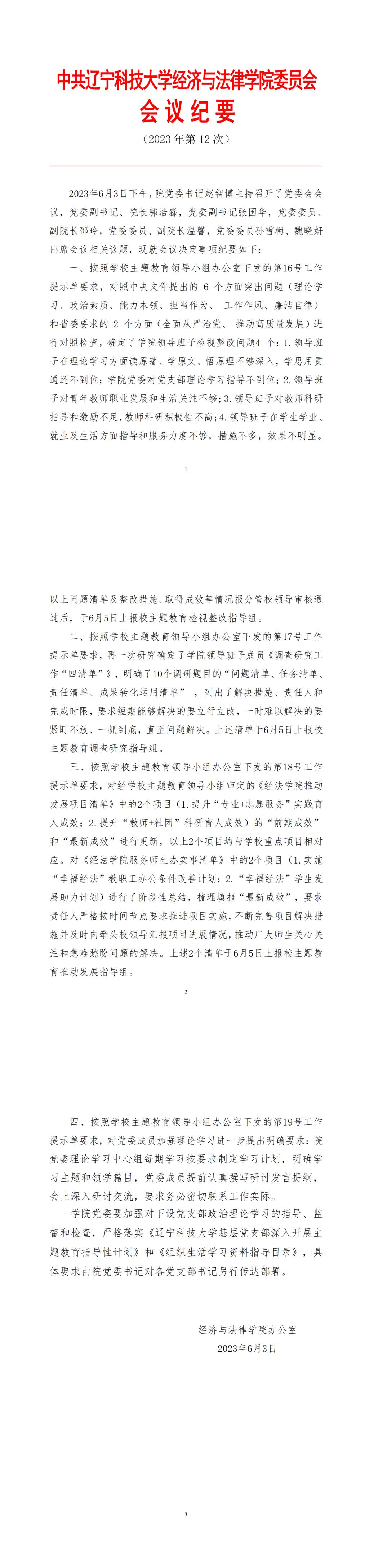 中共九州体育·(中国)官方网站经济与法律学院委员会会议纪要(2023年第12次)