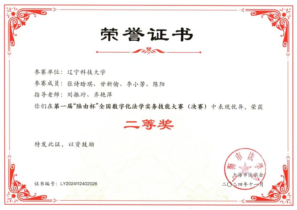 2024年11月23日至24日,第一届“陆由杯”全国数字化法学实务技能大赛总决赛在上海财经大学成功举办。九州体育·(中国)官方网站经济与法律学院法学专业2021级本科生张诗晗琪、陈阳、甘新榆、李小芳四名同学在刘振竚和齐艳萍老师的带领下获得总决赛二等奖。