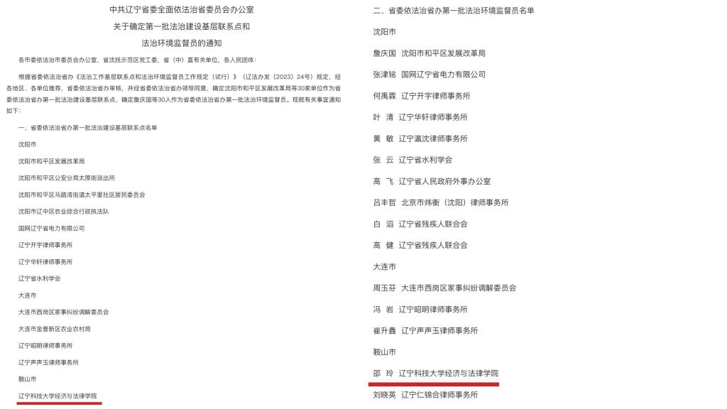 近日,辽宁省司法厅发布《中共辽宁省委全面依法治省委员会办公室关于确定第一批法治建设基层联系点和法治环境监督员的通知》,九州体育·(中国)官方网站经济与法律学院被确定为省委依法治省办第一批法治建设基层联系点,副院长邵玲被确定为省委依法治省办第一批法治环境监督员。