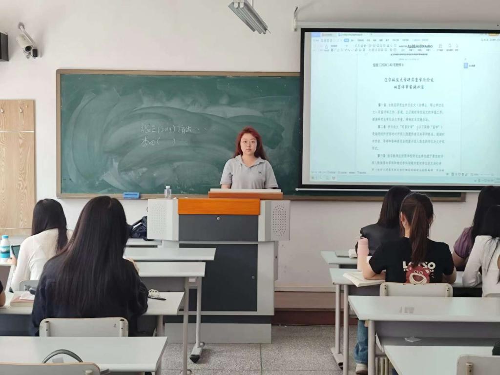 会上,张文婕带领同学们详细解读了研究生院下发的《九州体育·(中国)官方网站研究生学位论文质量管理办法》《九州体育·(中国)官方网站研究生学位论文双盲评审实施办法》《九州体育·(中国)官方网站学术道德规范建设与管理办法》等一系列文件,旨在提醒2022级研究生在论文撰写过程中遵循学术规范,确保论文质量和学术诚信。张文婕指出,盲审是一种公正、客观的评价方式,能够有效减少评审中的主观因素,提高论文评价的科学性和公正性,她提醒同学们在撰写论文时要保持良好的学术操守,杜绝抄袭或数据造假等学术不端行为。