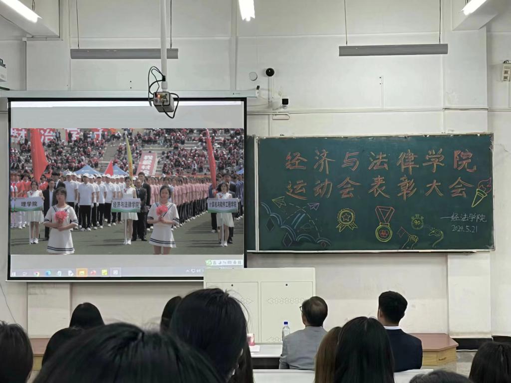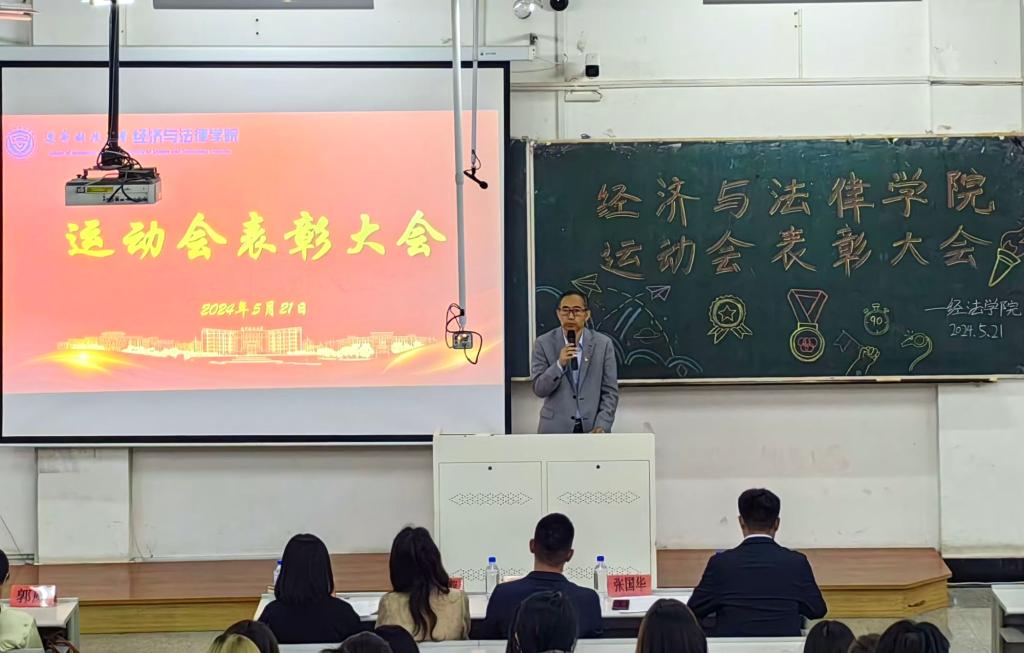 5月21日晚,经法学院于博学楼C102召开第五十二届运动会表彰大会。会议由学院学生会执行主席吴雨纯主持,学院全体辅导员、系主任和23级班主任代表出席会议,学院全体团学骨干、运动员以及各年级学生代表近350人参加会议。