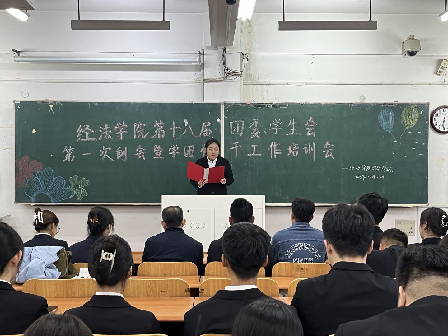 10月23日下午,经法学院第十八届团委、学生会第一次例会暨学团骨干工作培训会在博学楼C112举行。学院党委书记赵智博、党委副书记张国华、团委副书记张鹏飞出席会议,经法学院学生会全体学团骨干参加了本次会议。会议由经法学院第十八届学生会执行主席兼办公室负责人吴雨纯主持。