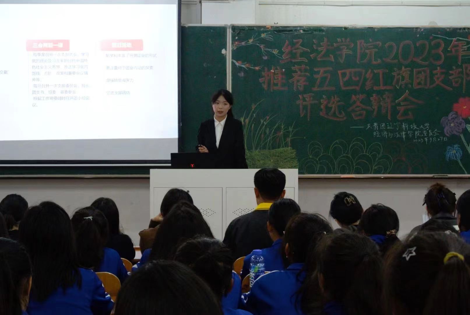 9月27日,经法学院于博学楼C112举办“五四红旗团支部”评选答辩会。本次答辩会由分团委工作人员赵子涵主持,学院团委副书记张鹏飞、分团委副书记王菀舒、院学生会主席团成员韩杬希、刘爱琳,生活权益部负责人王鑫、分团委组织与宣传部门成员以及21级、22级各团支部书记担任答辩评委。