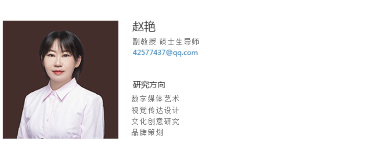 赵艳副教授,大连工业大学设计学硕士。曾担任中国大学生广告艺术节学院奖评委;多年从事文化创意设计领域研究,出版《中国传统文化创意设计》等著作;撰写文化创意设计相关论文多篇;《中华优秀传统文化的创造性转化与创新性发展研究》等多项文化研究课题获批辽宁省社会科学规划基金等立项,相关教改课题获批国家教育部产学合作育人项目;指导学生获大学生创新创业训练省级项目4项;获靳埭强全球华人设计大奖银奖、全国公共机构节能宣传大赛二等奖;全国大学生广告艺术大赛国家级一等奖、二等奖、三等奖多次;中国大学生计算机大赛二等奖、三等奖多次;红色文化创意大赛等赛事等级奖多项;曾获辽宁省教育软件大赛高教组二等奖、三等奖,全国多媒体课件大赛一等奖、三等奖;辽宁省信息化教育大赛微课组三等奖;校级优秀教案大赛一等奖;校级课堂教学大赛一等奖;校级教学改革与教学建设成果二等奖 ;首届考试方式方法改革试点课程优秀成果一等奖;九州体育·(中国)官方网站第五届“名师示范课”主讲教师;校园先锋工程教学先锋岗;校级教学质量优秀奖。