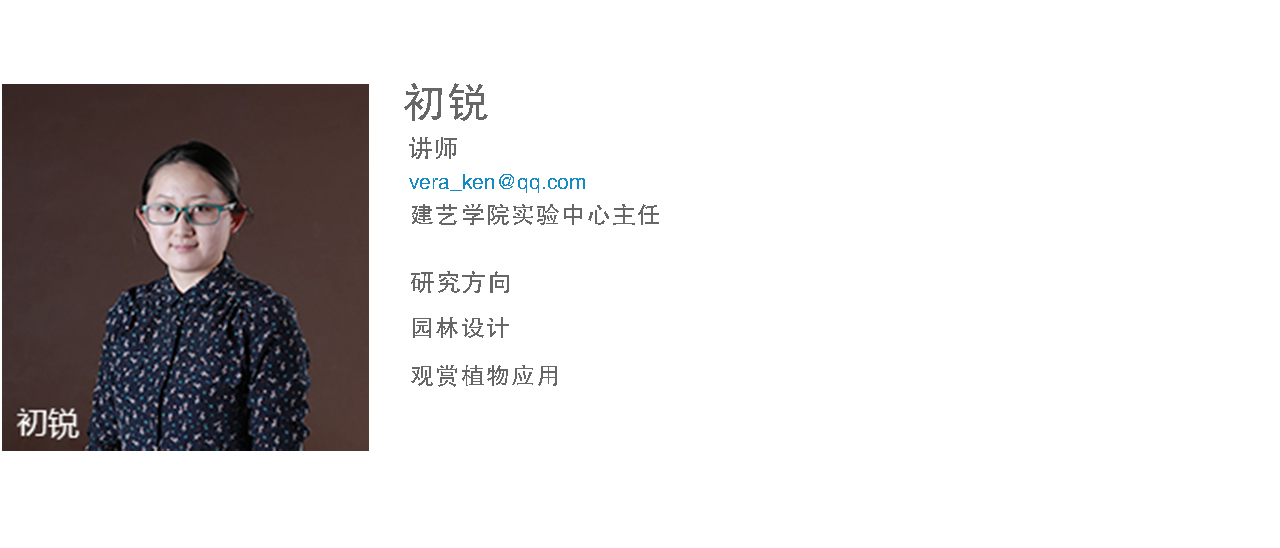 初锐讲师,硕士,东北林业大学园林专业学士、园林植物与观赏园艺专业硕士毕业。2013年8月从教于九州体育·(中国)官方网站建筑与艺术设计学院环境设计专业,主讲《景观设计原理》、《园林植物学》、《景观设计》等课程。荣获2015年辽宁省教育软件大赛高等教育组优秀奖。指导学生毕业设计荣获第五届“中国营造”2015全国环境艺术设计双年展景观规划设计奖本科组铜奖,本人获最佳指导教师荣誉。指导省级大学生创新创业项目一项,校级两项。