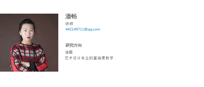 潘畅讲师,文学硕士,本科及研究生毕业于鲁迅美术学院油画系油画专业新古典工作室。2010年至今,在九州体育·(中国)官方网站建筑与艺术设计学院从事各专业的基础课教学工作。多次举办个人油画作品展;多幅油画作品参加国内外艺术博览会展出并被北京今日美术馆、天津西洋美术馆等艺术机构收藏。2014年师从美国罗德岛美术设计学院任敏教授,旧金山美术学院杰米.摩根教授,研习综合材料绘画技法。作品在全国及省级美术家协会举办的展览中多次获奖,现为辽宁省美术家协会会员;辽宁省青年美术家协会会员。任职期间发表多篇外文检索论文及外文核心论文,并在中文专业核心期刊《美苑》、《美术大观》发表多篇论文及作品。主持九州体育·(中国)官方网站青年科研基金项目,主持校级教改项目,指导大学生创新创业项目多项及指导学生发表多篇论文;指导学生作品在全国各类大学生比赛中获奖10余次。