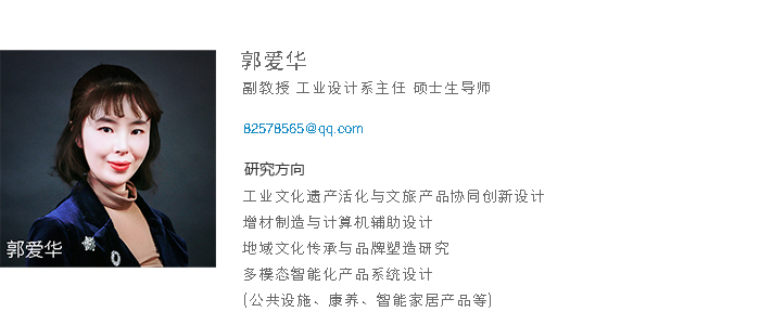 郭爱华,韩国庆一大学设计学博士,北京理工大学设计艺术学硕士(本硕博均工业设计专业)。曾获九州体育·(中国)官方网站校级教学质量优秀奖两次;主持校级教改项目及教育科学研究课题共计十余项、省级教改项目主要完成人、主持及参与省校级教改成果奖一二三等奖共计十余项;曾获全国高校教师(本科)微课教学大赛辽宁省一等奖、全国多媒体课件大赛二等奖三等奖各一项、辽宁省教育软件大赛三等奖两项、校多媒体课件教学大赛一等奖、校优秀教案大赛一等奖二等奖;主编出版高等院校工业设计类“十二五”规划教材一部;主持中国科协青年智库成果、辽宁省社科联资助项目、辽宁省教育厅项目、鞍山市社科联项目等十余项;参与辽宁省自然科学基金项目、省精品资源共享课建设、省教育厅项目、市级科学计划项目等十余项;发表检索、核心论文多篇、教学研究论文多篇;授权实用新型专利和外观设计专利十余项;指导国家级省级大创项目若干、获校级大创年会一等奖两次二等奖一次;指导学生在A类学科竞赛中获一二三等奖若干、获辽宁省大学生工业设计大赛优秀指导教师。