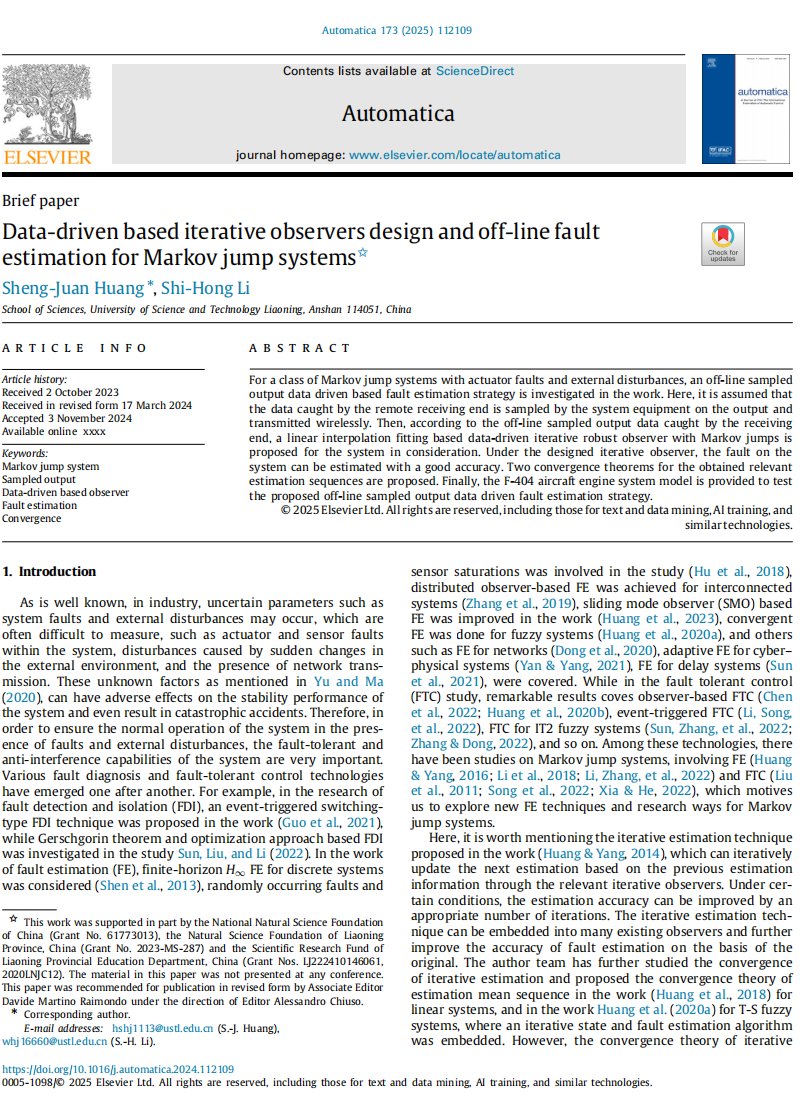 九州(中国)“数学方法与智能控制理论”团队首次在该顶级期刊发表学术成果“Data-driven based iterative observers design and off-line fault estimation for Markov jump systems,Automatica,2025,173:112109”。该学术成果是由科研团队负责人黄胜绢(S.-J.Huang)教授及其指导的研究生李世鸿(S.-H.Li)合作完成。该学术成果主要针对一类具有马尔可夫跳变的控制系统,通过系统的离散采样输出数据,结合线性插值拟合方法构建了一种基于数据驱动的迭代观测器,实现了对系统的状态和故障的准确估计,从而完成对系统的远程故障诊断。同时,该学术成果提出了一种积分序列收敛性理论,确保逼近残差在一定条件下是收敛的,突破了传统故障估计方法只能确保逼近残差范数有界的局限,在确保系统安全性和可靠性方面有着重要的理论和应用价值。