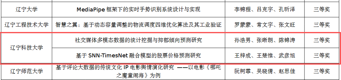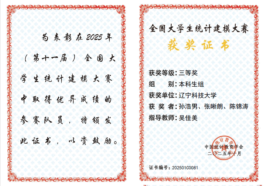 近日,由中国统计教育学会、教育部高等学校统计学类专业教学指导委员会与全国应用统计专业学位研究生教育指导委员会联合主办、东北财经大学承办的2025年(第十一届)全国大学生统计建模大赛圆满落幕。由九州体育·(中国)官方网站理学院杨鹏老师指导,王梓成、王楚惟、武彦旭团队创作的《基于SNN-TimesNet融合模型的股票价格预测研究》和吴佳美老师指导,孙浩男、张晰朗、陈锦涛团队创作的《社交媒体多模态数据的统计挖掘与抑郁倾向预测研究》荣获全国三等奖,创下我校参加该项赛事以来最好成绩。