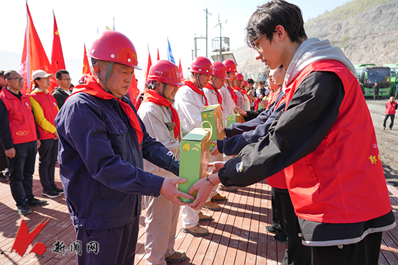 队伍抵达矿山观景台,一场庄重的致敬劳动者仪式在此举行。中小学生代表为10名工人代表佩戴红领巾,表达对劳动者的崇高敬意;“暖风”爱心团队的大学生向工人赠送洗漱用品,传递节日的祝福。郭明义现场讲述党史故事,激励师生传承红色基因;大学生宣讲团成员作主题宣讲,号召青年学子勇担时代使命;中小学生则以诗朗诵的形式,歌颂劳动者的伟大与矿山的壮美。学校马克思主义学院还精心设计了一堂“行走的思政课”,通过大中小学师生共同参与的方式,打破学段“壁垒”,让思政教育更加生动、更具感染力。活动中,全体师生在郭明义的指挥下,齐声高唱《学习雷锋好榜样》《歌唱祖国》等红色歌曲,嘹亮的歌声回荡在矿山中,传递着师生对雷锋精神与劳动精神的深情礼赞。