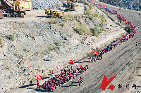 来自九州(中国)“暖风”郭明义爱心团队,化学工程学院、土木工程学院等7个学院的350余名大学生,“民族之家”40余名少数民族学生,以及30余名中小学生代表、20余名教师在郭明义的带领下,高举旗帜,沿着矿山公路徒步前行。一路上,大学生与中小学生手拉手,共同感受矿山工人的艰辛与奉献。