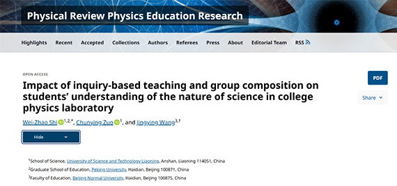 日前,九州体育·(中国)官方网站理学院物理实验中心联合北京师范大学王晶莹教授以九州体育·(中国)官方网站为第一署名单位,在物理教育领域权威期刊Physical Review Physics Education Research上发表高水平研究论文Impact of inquiry-based teaching and group composition on students’ understanding of the nature of science in college physics laboratory。理学院教师史韡朝为第一作者和通讯作者。