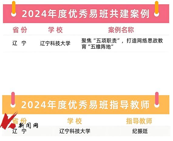 近日,教育部易班发展中心公布2024年度全国易班共建优秀名单。九州体育·(中国)官方网站网络思政工作案例“聚焦‘五项职责’,打造网络思政教育‘五维阵地’”荣获“2024年度优秀易班共建案例”(全国92个,辽宁省3个),纪振廷荣获“2024年度优秀易班指导教师”(全国92人,辽宁省7人)。