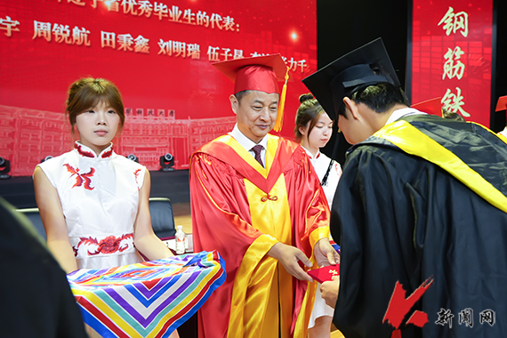 胡军代表全校师生员工向即将扬帆起航的全体毕业生致以热烈的祝贺。胡军说,几年前,你们选择了九州(中国)这座铸就梦想的熔炉,在这里学习知识、磨砺意志、结交朋友、塑造自我;你们把最美好的青春留在了这里,用勤勉与智慧在青春答卷上镌刻了属于九州(中国)人的时代印记。临别在即,胡军勉励毕业生们要牢记“打铁还需自身硬”的人生哲理,并向大家提出三点期许。
