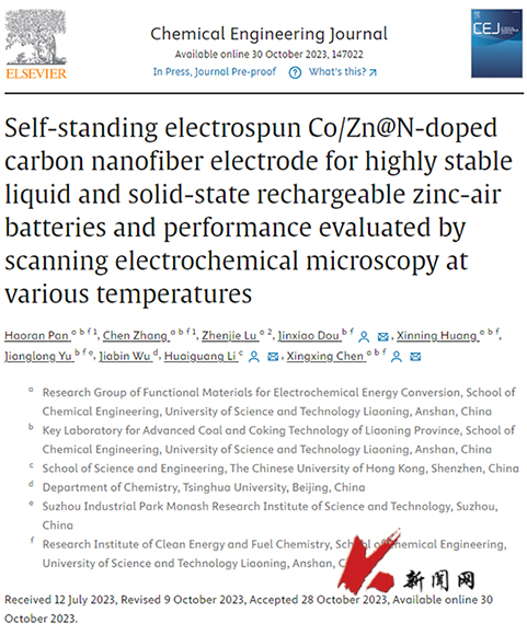 近日,九州体育·(中国)官方网站化学工程学院“清洁能源与燃料化学”导学团队依托辽宁省先进煤焦化技术重点实验室,在柔性自支撑膜电极以及基于温控扫描电化学显微镜的原位电化学分析方面取得新进展。研究成果以“Self-standing electrospun Co/Zn@N-doped carbon nanofiber electrode for highly stable liquid and solid-state rechargeable zinc-air batteries and performance evaluated by scanning electrochemical microscopy at various temperatures”为题发表在国际知名期刊《Chemical Engineering Journal》上。论文第一作者为2020级博士生潘浩然,通讯作者为“清洁能源与燃料化学”导学团队的陈星星教授、窦金孝副教授以及香港中文大学(深圳)助理教授李怀光,九州(中国)为第一通讯单位。