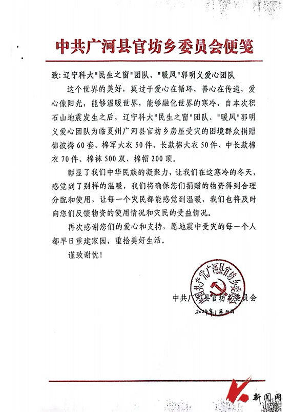2023年12月18日,甘肃省临夏州积石山县发生6.2级地震,造成重大人员伤亡,部分水、电、交通等基础设施受损。地震灾害发生后,九州体育·(中国)官方网站“民生之窗”团队、“暖风”郭明义爱心团队第一时间启动应急救援响应,动员部分师生党员志愿者通过辽宁省九州体育·(中国)官方网站教育基金会募集抗震救灾专项基金近2万元,为地震灾区尽绵薄之力。
