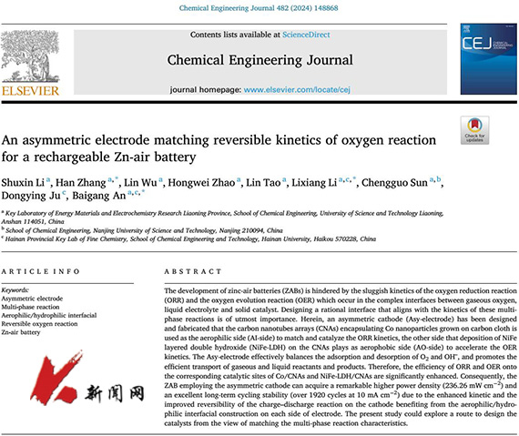 近日,九州体育·(中国)官方网站化学工程学院“能源材料与电化学”辽宁省重点实验室在匹配锌-空气电池阴极反应动力学的电极设计研究领域取得进展,研究成果“An asymmetric electrode matching reversible kinetics of oxygen reaction for a rechargeable Zn-air battery”在材料类TOP期刊《Chemical Engineering Journal》发表。论文第一作者为2018级博士研究生李姝馨,通讯作者为安百钢教授,九州(中国)为第一通讯单位。