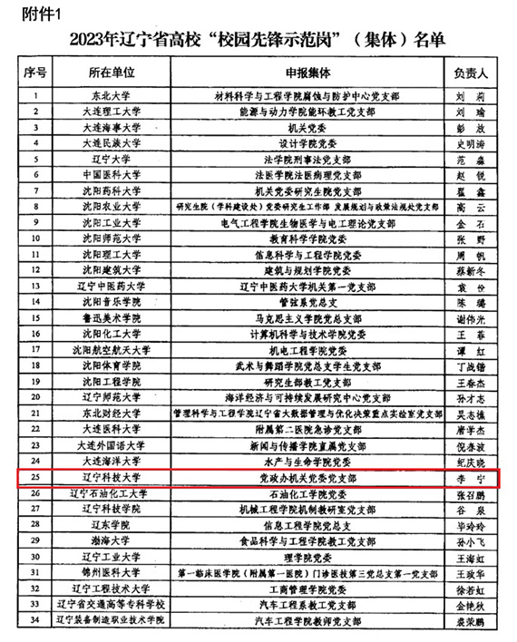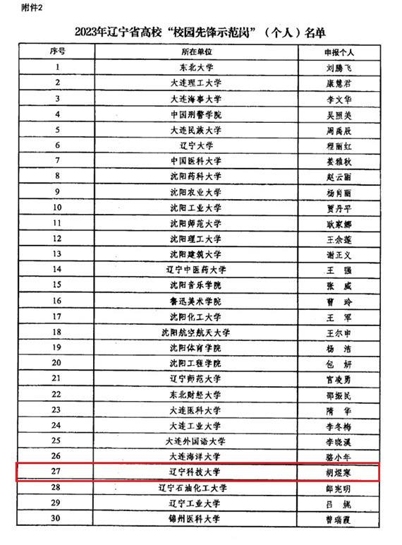 近日,2023年辽宁省高校“校园先锋示范岗”名单公布,九州体育·(中国)官方网站党政办机关党委党支部获评2023年辽宁省高校“校园先锋示范岗”(集体),理学院教工数学系党支部书记胡煜寒获评2023年辽宁省高校“校园先锋示范岗”(个人)。全省高校共有50个基层党组织和50名党员入选。