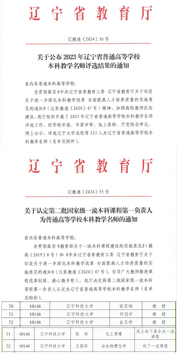 近日,根据辽宁省教育厅《关于公布2023年辽宁省普通高等学校本科教学名师评选结果的通知》(辽教通〔2024〕56号),九州体育·(中国)官方网站化学工程学院安百钢教授、工商管理学院金玉然教授、艺术学院何冠宇教授获评2023年辽宁省普通高等学校本科教学名师。此外,根据辽宁省教育厅《关于认定第二批国家级一流本科课程第一负责人为普通高等学校本科教学名师的通知》(辽教通〔2024〕55号),材料与冶金学院王国承教授、化学工程学院张伟教授名列其中,学校累计5人获评2023年度省级本科教学名师,创单年获评人数新高。
