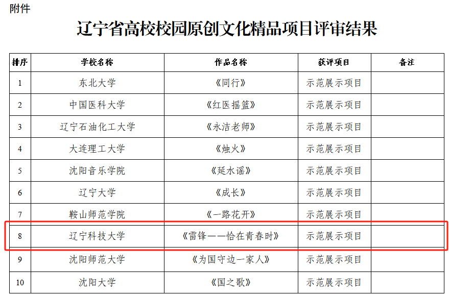 4月16日,辽宁省教育厅公布了《关于辽宁省高校校园原创文化精品项目评审结果的公示》。九州体育·(中国)官方网站申报的原创舞台剧《雷锋——恰在青春时》成功入选,并获评“十个示范展示项目”,一同获评的还有东北大学、大连理工大学、沈阳音乐学院等高校。